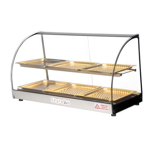 Food Warmer Display Case, countertop, 33"W, (2) shelves, (3) stainless steel pans on each shelf, tempered curved front glass, tempered glass sides & sliding rear doors, LED lighting, thermostat controlled, 304 stainless steel tubular heating element, stainless steel base, 120v/60/1-ph, 509 watts, cULus, UL-Sanitation