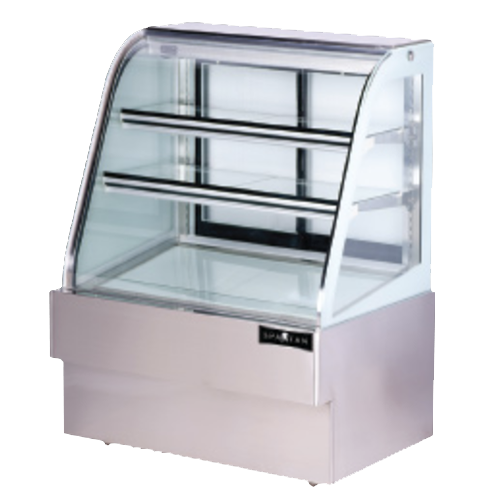 Curved Glass Deli Case, 35-2/5", bottom mounted self-contained refrigeration, anti-fog glass face, (2) adjustable glass shelves (12" & 16") plus 21" base, interior lighting, digital temperature display, (2) rear doors, 201 stainless steel exterior, R290 Hydrocarbon refrigerant, (4) casters, 3/8 HP, 110v/60/1-ph, 6.0 amps, NEMA 5-15P, cETLus, ETL-Sanitation