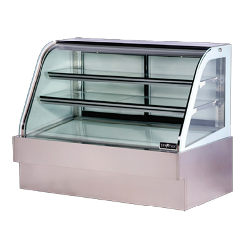 Curved Glass Deli Case, 59", bottom mounted self-contained refrigeration, anti-fog glass face, (2) adjustable glass shelves (12" & 16") plus 21" base, interior lighting, digital temperature display, (2) rear doors, 201 stainless steel exterior, R290 Hydrocarbon refrigerant, 1/2 HP, 110v/60/1-ph, 9.2 amps, NEMA 5-15P, cETLus, ETL-Sanitation