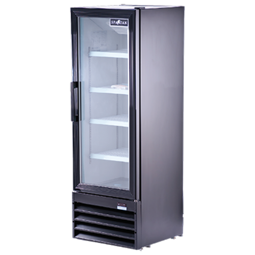Reach-In Refrigerator Merchandiser, one-section, 10.0 cu. ft., bottom mounted self-contained refrigeration, self closing anti-fog glass door, (4) adjustable plastic coated steel shelves, fluorescent interior lighting, mechanical temperature control, painted steel exterior, R290 Hydrocarbon refrigerant, 1/5 HP, 120v/60/1-ph, 4.6 amps, NEMA 5-15P, cETLus, ETL-Sanitation