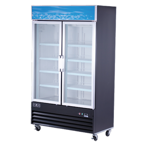 Reach-In Refrigerator Merchandiser, two-section, 27.0 cu. ft., bottom mounted self-contained refrigeration, self closing anti-fog glass doors, (8) adjustable plastic coated steel shelves, fluorescent interior lighting, digital temperature control, painted steel exterior, (4) casters (2 front locking), R290 Hydrocarbon refrigerant, 1/2 HP, 120v/60/1-ph, 11.8 amps, NEMA 5-15P, cETLus, ETL-Sanitation