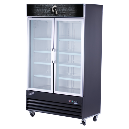 Reach-In Refrigerator Merchandiser, two-section, 45 cu. ft., bottom mounted self-contained refrigeration, self closing anti-fog glass doors, (8) adjustable plastic coated steel shelves, fluorescent interior lighting, digital temperature control, painted steel exterior, (4) casters (2 front locking), R290 Hydrocarbon refrigerant, 1/4+ HP, 115v/60/1-ph, 4.3 amps, NEMA 5-15P, cETLus, ETL-Sanitation