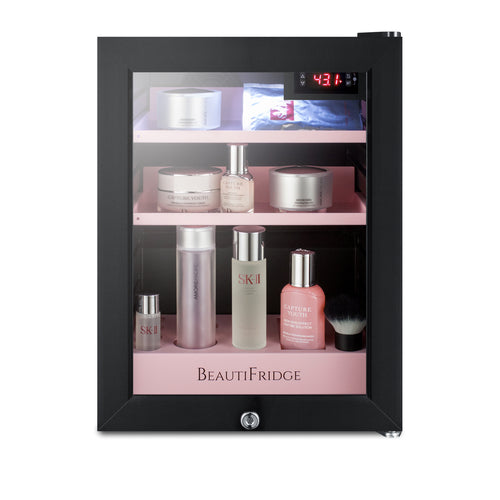 BeautiFridge Cosmetics Refrigerator, compact, one section, 13-3/4"W, 0.85 cu.ft., 42 to 65ºF temperature range, (1) hinged double pane tempered glass reversible door with lock, (2) adjustable tray-style shelves with matte pink blush finish, (1) bottle shelf with matte pink blush finish, interior LED lighting, digital thermostat, automatic defrost, black exterior finish, black interior, leg levelers, rear mount self-contained refrigeration, R600a Hydrocarbon refrigerant, 115v/60/1-ph, 1.3 amps, ETL, ETL-Sanitation (Residential)