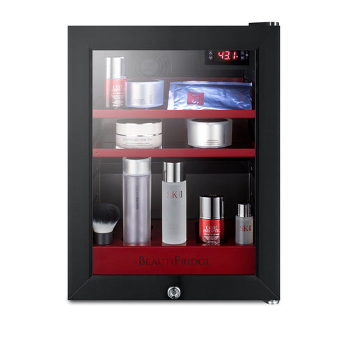 BeautiFridge Cosmetics Refrigerator, compact, one section, 13-3/4"W, 0.85 cu.ft., 42 to 65ºF temperature range, (1) hinged double pane tempered glass reversible door with lock, (2) adjustable tray-style shelves with ruby finish, (1) bottle shelf with ruby finish, interior LED lighting, digital thermostat, automatic defrost, black exterior finish, black interior, leg levelers, rear mount self-contained refrigeration, R600a Hydrocarbon refrigerant, 115v/60/1-ph, 1.3 amps, ETL, ETL-Sanitation (Residential)