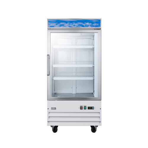 Aluminum Beer Can Froster, reach-in, one-section, 27"W, 9.0 cu. ft. capacity, +24° to +35°F temperature range, frost-free defrost, illuminated canopy, (1) right hinged self-closing double pane glass door, LED light, (3) adjustable wire cantilevered shelves, digital controls & thermostat, interior fan, white exterior, (4) 5" casters, self contained refrigeration, bottom-mounted compressor, R290a Hydrocarbon refrigerant, 115v/60/1-ph, 4.2 amps, cord, cETLus, ETL-Sanitation (Commercial)
