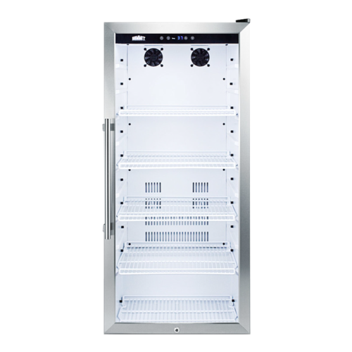 Beverage Center, reach-in, one-section, 21.25"W x 22.5"D x 48.5"H, 9.0 cu. ft. capacity, 34° to 43°F temperature range, reversible double pane tempered glass door with stainless steel trim, fan-forced cooling, automatic defrost, lock, white exterior, digital thermostat, LED lighting, (5) adjustable wire shelves, self-contained, 115v/60/1-ph, 2.0 amps, ETL, ETL-Sanitation (Commercial)