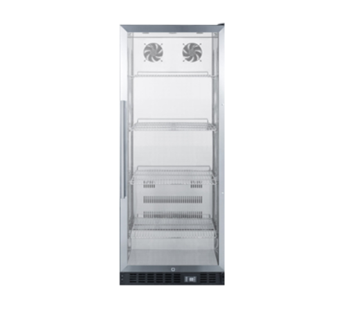 Beverage Merchandiser, one-section, 23.63"W x 22.88"D x 58.38"H, 11.0 cu. ft. capacity, (4) cantilevered chrome shelves, stainless steel interior, stainless steel trimmed glass door, self-closing door, stainless steel handle, front lock, stainless steel exterior, digital thermostat, automatic defrost, high temperature alarm, open door alarm, interior fan, recessed LED lighting, sealed back, 115v/60/1-ph, 1.7 amps, ETL-Sanitation to NSF-7, ETL, cETL (Commercial)