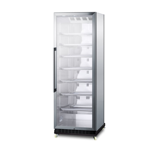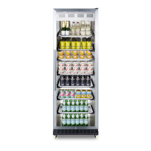 Beverage Center, one section, 12.6 cu. ft. capacity, self contained bottom mount refrigeration, self-closing right hinged glass door with lock, (7) adjustable tray holders on cantilevered shelving, (7) aluminum half sheet pans, (7) chrome shelves, LED lighting, digital controls, frost-free operation, stainless steel interior, black exterior finish, R600a hydrocarbon refrigerant, with removable dolly, 115v/60/1-ph, 1.7 amps, cord & plug, ETL (Commercial)