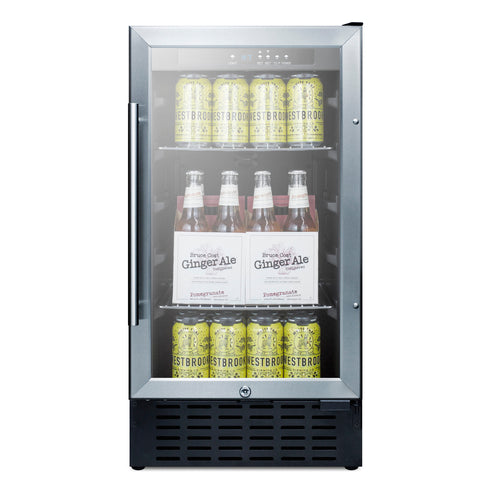 Beverage Center, built-in or freestanding, ADA compliant, 18"W, 2.7 cu. ft. capacity, self-contained bottom mounted refrigeration, digital controls, 34°F to 64°F temperature range, (1) reversible right hinged locking glass door with stainless steel trim, stainless steel pro style handle, (4) adjustable chrome shelves, LED light, automatic defrost, sealed back, black cabinet, (2) level legs, interior & exterior fan, R600a Hydrocarbon refrigerant, 115v/60/1-ph, 1.25 amps, cord, cETLus, ETL-Sanitation (Commercial)