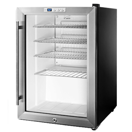 Beverage Merchandiser, reach-in, one-section, 2.5 cu.ft. capacity, built-in or freestanding, automatic defrost, digital thermostat, LED lighting, chrome shelves, black exterior finish, stainless steel trimmed glass door, lock, RHD door swing, 115v/60/1, 1.3 amps, ETL-S (Commercial)