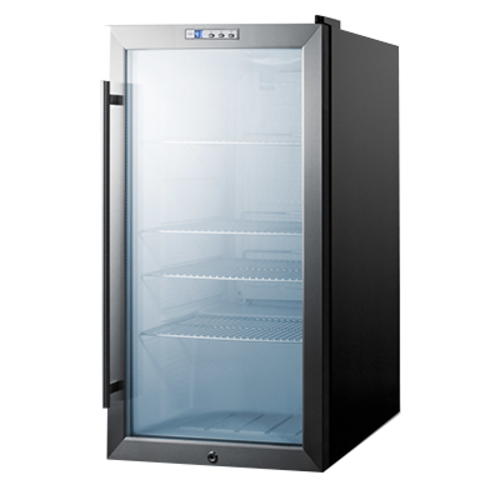 Beverage Center, reach-in, one-section, freestanding use, 3.35 cu.ft., glass door with stainless steel trim, front lock, automatic defrost, adjustable chrome shelves, LED lighting, digital thermostat, RHD door swing, black exterior finish, 115v/60/1, 1.3 amps, ETL-S (Commercial)