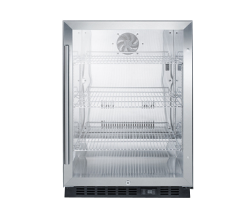 Beverage Merchandiser, one-section, 5.0 cu. ft. capacity, built-in or freestanding, (3) cantilevered chrome shelves, stainless steel interior, stainless steel trimmed glass door, reversible door, stainless steel handle, front lock, stainless steel exterior, digital thermostat, automatic defrost, high temperature alarm, open door alarm, interior fan, recessed LED lighting, sealed back, 115v/60/1, .8 amps, ETL-S to NSF-7, ENERGY STAR® (Commercial)