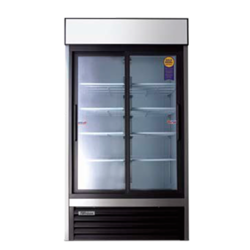 Refrigerator, merchandiser, two-section, 53-1/4"W, bottom mounted self-contained refrigeration, 48.0 cu. ft. capacity, (8) adjustable epoxy coated wire shelves, dial thermostat knob, (2) glass sliding doors, fluorescent lighting with on/off switch, includes condensate drain pan, stainless steel interior floor, white coated steel interior & exterior, adjustable legs, R134a, 1/2 HP, 115v/60/1-ph, 9.0 amps