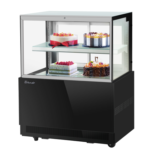 Refrigerated Bakery Display Case, 35-3/8"W x 27-1/2"D x 46-1/4"H, 9 cu. ft. capacity, self-contained refrigeration with self-cleaning condenser, straight tilt-out tempered glass front, tempered glass side pannels, sliding rear doors, digital temperature controller, (1) adjustable tempered glass shelf with stainless steel front & back edges, deck is white with a mirror finish, LED interior lighting, stainless steel interior, specify extior color, 3" swivel casters (rear locking), R290 Hydrocarbon refrigerant, 1/3 HP, 115v/60/1-ph, 6.3 amps, cord with NEMA 5-15P, cETLus, ETL-Sanitation