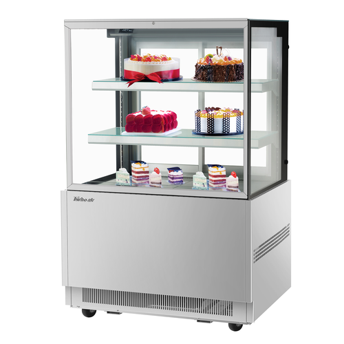 Refrigerated Bakery Display Case, 35-3/8"W x 27-1/2"D x 53-5/8"H, 12.5 cu. ft. capacity, self-contained refrigeration with self-cleaning condenser, straight tilt-out tempered glass front, tempered glass side pannels, sliding rear doors, digital temperature controller, (2) adjustable tempered glass shelves with stainless steel front & back edges, deck is white with a mirror finish, LED interior lighting, stainless steel interior & exterior, 3" swivel casters (rear locking), R290 Hydrocarbon refrigerant, 1/3 HP, 115v/60/1-ph, 7.0 amps, cord with NEMA 5-15P, cETLus, ETL-Sanitation