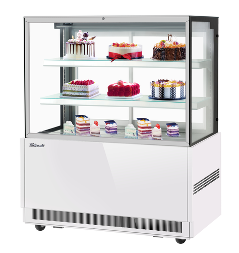 Refrigerated Bakery Display Case, 47-1/4"W x 27-1/2"D x 53-5/8"H, 17.2 cu. ft. capacity, self-contained refrigeration with self-cleaning condenser, straight tilt-out tempered glass front, tempered glass side pannels, sliding rear doors, digital temperature controller, (2) adjustable tempered glass shelves with stainless steel front & back edges, deck is white with a mirror finish, LED interior lighting, stainless steel interior, specify exterior color, 3" swivel casters (rear locking), R290 Hydrocarbon refrigerant, 3/4 HP, 115v/60/1-ph, 8.2 amps, cord with NEMA 5-15P, cETLus, ETL-Sanitation