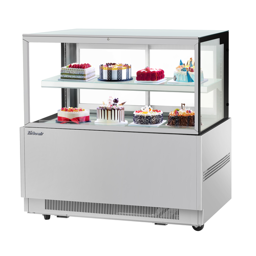 Refrigerated Bakery Display Case, 59"W x 27-1/2"D x 46-1/4"H, 15.7 cu. ft. capacity, self-contained refrigeration with self-cleaning condenser, straight tilt-out tempered glass front, tempered glass side pannels, sliding rear doors, digital temperature controller, (1) adjustable tempered glass shelf with stainless steel front & back edges, deck is white with a mirror finish, LED interior lighting, stainless steel interior & exterior, 3" swivel casters (rear locking), R290 Hydrocarbon refrigerant, 3/4 HP, 115v/60/1-ph, 7.3 amps, cord with NEMA 5-15P, cETLus, ETL-Sanitation