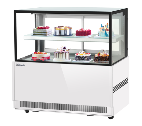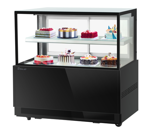 Refrigerated Bakery Display Case, 59"W x 27-1/2"D x 44"H, 15.7 cu. ft. capacity, self-contained refrigeration with self-cleaning condenser, straight tilt-out tempered glass front, tempered glass side pannels, sliding rear doors, digital temperature controller, (1) adjustable tempered glass shelf with stainless steel front & back edges, LED interior lighting, stainless steel interior, specify exterior color, 3" swivel casters (rear locking), R290 Hydrocarbon refrigerant, 3/4 HP, 115v/60/1-ph, 6.5 amps, cord with NEMA 5-15P, cETLus, ETL-Sanitation