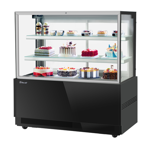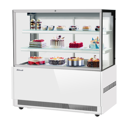 Refrigerated Bakery Display Case, 59"W x 27-1/2"D x 53-5/8"H, 21.8 cu. ft. capacity, self-contained refrigeration with self-cleaning condenser, straight tilt-out tempered glass front, tempered glass side pannels, sliding rear doors, digital temperature controller, (2) adjustable tempered glass shelves with stainless steel front & back edges, deck is white with a mirror finish, LED interior lighting, stainless steel interior, specify exterior color, 3" swivel casters (rear locking), R290 Hydrocarbon refrigerant, 3/4 HP, 115v/60/1-ph, 8.7 amps, cord with NEMA 5-15P, cETLus, ETL-Sanitation