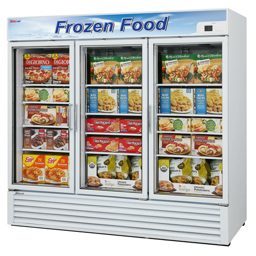 Freezer Merchandiser, three-section, 58.45 cu. ft. capacity, 81-7/8"W x 29-1/8"D x 78-1/4"H, bottom mount self-contained refrigeration, (3) hinged triple pane heated glass door, (12) adjustable PE coated wire shelves, LED lighting, digital temperature controller, monitoring system, door opening alarm, automatic fan motor delays, Turbo freezing, smart defrost, LED top sign panel, specify exterior color, R290 Hydrocarbon refrigerant, (2) 2/3 HP, 115v/60/1-ph, 15.2 amps, cord with NEMA 5-20P, cETLus, ETL-Sanitation