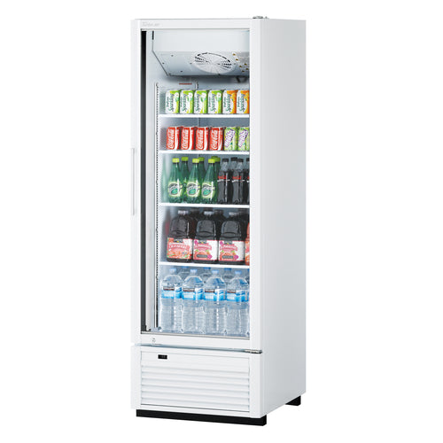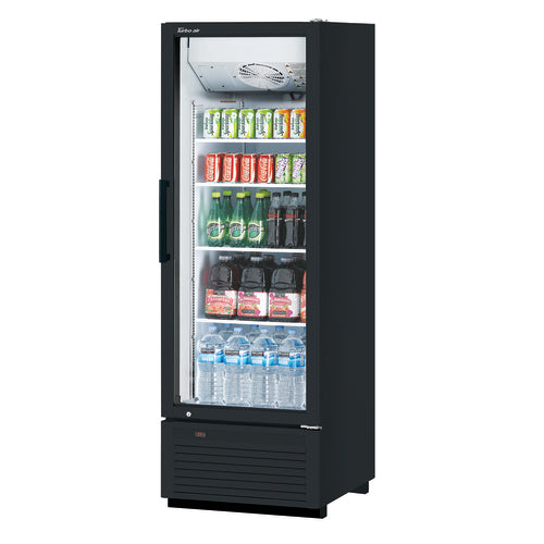 Super Deluxe Refrigerated Merchandiser, one-section, 19.02 cu. ft., (405) 12 oz bottle capacity (486 with additional shelf), 27"W x 30.25"D x 77"H, self-contained bottom mounted refrigeration, 33° to 38°F temperature range, self-cleaning condenser device equipped, (1) double pane Low-E glass door with lock (hinged right), door activated alarm system, exterior digital thermometer & controller, self-diagnostic monitoring system, LED interior lighting, (4) adjustable PE coated wire shelves, automatic fan motor delays, white interior, specify exterior color, R600a Hydrocarbon refrigerant, 1/5 HP, 115v/60/1-ph, 2.2 amps, cord, NEMA 5-15P, cETLus, ETL-Sanitation, ENERGY STAR®