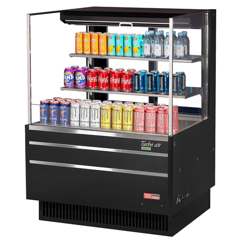 Horizontal Open Display Merchandiser, low-profile, 11.1 cu. ft. capacity, 34-3/4"W x 33-3/4"D x 52-1/2"H, self-contained refrigeration with self-cleaning condenser, rear sliding glass doors, tempered glass front shield & side panels, stainless steel interior, (2) shelves + deck, digital electronic thermostat with defrost control, solar digital thermometer, LED interior lighting, specify exterior color, includes night cover, front air intake & rear air discharge, R290 Hydrocarbon refrigerant, (2) 3/4 HP, 115v/60/1-ph, 11.3 amps, cord with NEMA 5-20P, CSA-Sanitation, cCSAus