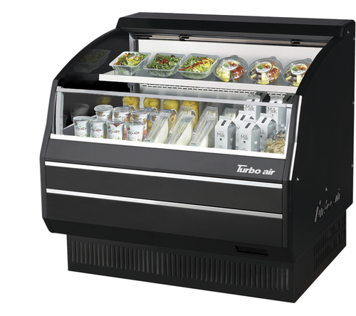 Horizontal Open Display Merchandiser, low-profile, 7.4 cu. ft. capacity, 39-1/8" W x 33-1/2"D x 45-7/8"H, self-contained refrigeration, self-cleaning condenser, tempered glass front shield, solid side panels, (1) adjustable shelf, LED interior lighting under each shelf, specify interior, black panels, R290 Hydrocarbon refrigerant, 3/4 HP, 115v/60/1-ph, 6.9 amps, cord with NEMA 5-15P, cETLus, ETL-Sanitation