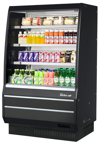 Vertical Open Display Merchandiser, mid-height, 9.3 cu. ft. capacity, 39-1/8"W x 26-7/8"D x 60-1/4"H, self-cleaning condenser device, open front, tempered glass front shield & side walls, (3) adjustable stainless steel shelves in 1" increments, LED lights, hot gas condensate system, energy saving night curtain standard, specify interior, black exterior, front air intake & rear air discharge, R290 Hydrocarbon refrigerant, (2) 3/4 HP, 115v/60/1-ph, 15.5 amps, cord with NEMA 5-20P, cETLus, ETL-Sanitation
