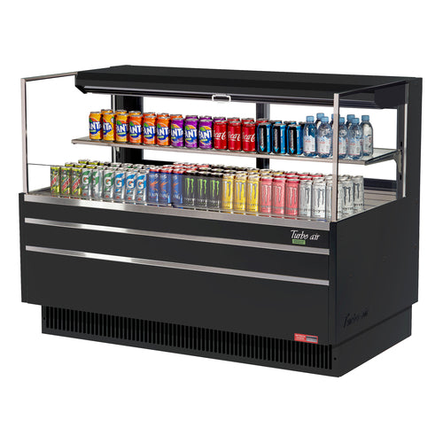 Horizontal Open Display Merchandiser, low-profile, 13.0 cu. ft. capacity, 58-3/4"W x 33-3/4"D x 44-1/4"H, self-contained refrigeration with self-cleaning condenser, rear sliding glass doors, tempered glass front shield & side panels, stainless steel interior, (1) shelf + deck, digital electronic thermostat with defrost control, solar digital thermometer, LED interior lighting, specify exterior color, includes night cover, front air intake & rear air discharge, R290 Hydrocarbon refrigerant, (2) 3/4 HP, 115v/60/1-ph, 15 amps, cord with NEMA 5-20P, cETLus, ETL-Sanitation