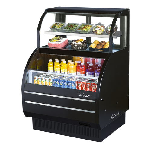 Open Display Merchandiser Combination Case with Refrigerated Top Shelf Combination Case, 38-7/8"W x 34"D x 56-1/2"H, 4.2 top/6.4 bottom cu. ft. capacity, tempered curved front glass, (2) stainless steel shelves, LED interior lighting, hot gas condensate system, black exterior with anti-rust coating, 300 stainless steel interior, front air intake & rear air discharge, self-contained system, self-cleaning condenser, no plumbing required, R290 Hydrocarbon refrigerant, 3/4 HP, 115v/60/1-ph, 6.9 amps, NEMA 5-15P, cETLus, ETL-Sanitation