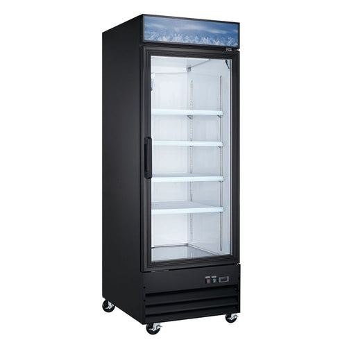 Coldline Refrigerator Merchandiser, one-section, 28-1/2"W, 23.0 cu. ft. capacity, bottom mounted self-contained mounted refrigeration, (1) self-closing glass hinged door with 90° stay open feature, (4) PVC coated adjustable wire shelves, 33° to 41°F temperature range, digital temperature control, automatic defrost, LED interior light, black exterior(white exterior also available), white interior with stainless steel floor, (4) casters (2 with brakes), R290 Hydrocarbon refrigerant, 1/5 HP, 115v/60/1-ph, 3.0 amps, cord, NEMA 5-15P, cETLus, ETL-Sanitation