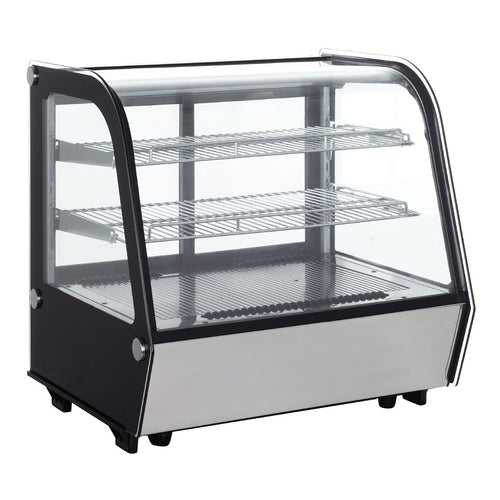 Marchia Refrigerated Display Case, countertop, 28"W, 4.25 cu. ft. capacity, bottom mounted self-contained mounted refrigeration, curved front glass, sliding rear doors, (2) adjustable chrome-plated shelves, 33° to 54.6°F temperature range, digital temperature control, automatic defrost, ventilated cooling system, LED interior lighting, black exterior, R134a refrigerant, 230 watts, 110v/60/1-ph, cord, NEMA 5-15P, cETLus, ETL-Sanitation