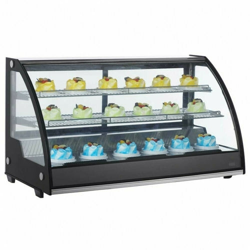 Marchia Refrigerated Display Case, countertop, 47-7/8"W, 7.1 cu. ft. capacity, bottom mounted self-contained mounted refrigeration, curved front glass, sliding rear doors, (2) adjustable chrome-plated shelves, 33° to 54.6°F temperature range, digital temperature control, automatic defrost, LED interior lighting, black exterior, R134a refrigerant, 375 watts, 110v/60/1-ph, cord, NEMA 5-15P, cETLus, ETL-Sanitation