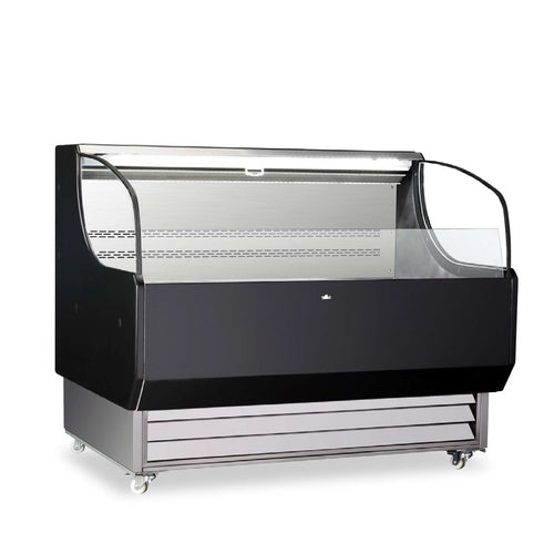 Horizontal Open Display Merchandiser, low-profile, 52"W, 13.1 cu. ft. capacity, side mounted self-contained refrigeration, (1) glass adjustable shelf, 36.6° to 51°F temperature range, night curtain, digital temperature control, automatic defrost, LED interior lighting, wood plastic board exterior, (4) casters (2 with brakes), R290 Hydrocarbon refrigerant, 450 watts, 110v/60/1-ph, 14.5 amps, NEMA 5-15P, CE