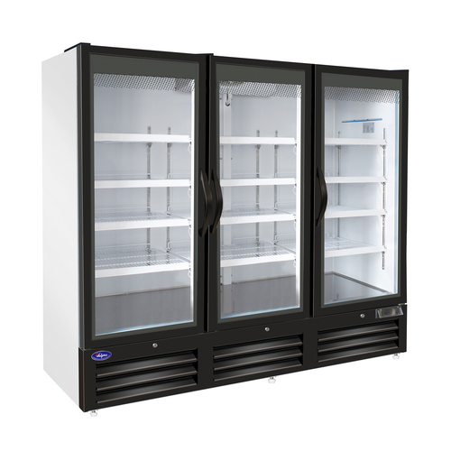 Freezer, reach-in, three-section, 81"W, 72 cu. ft. capacity, self-contained bottom mounted refrigeration, digital thermostat with LED display, (12) adjustable epoxy coated wire shelves, LED interior lighting, (3) self closing glass doors with locks, enamel baked steel exterior, stainless steel & aluminum interior, (6) casters, 1-1/4 HP, 115/208-230V/60/1-ph, 9.0 amps, cord, NEMA 14-20P, ETL, ETL-Sanitation