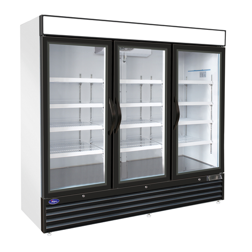 Refrigerator, reach-in, three-section, 81"W, 72 cu. ft. capacity, self-contained bottom mounted refrigeration, digital thermostat with LED display, (12) adjustable epoxy coated wire shelves, LED interior lighting, (3) self closing glass doors with locks, enamel baked steel exterior, stainless steel & aluminum interior, (6) casters, R290 Hydrocarbon refrigerant, 1/2 HP, 115V/60/1-ph, 7.5 amps, cord, NEMA 5-15P, ETL, ETL-Sanitation
