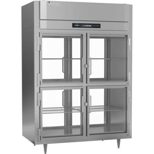UltraSpec™ Series Freezer, Pass-thru, two-section, self-contained refrigeration, 55.6 cu. ft. capacity, (8) wide half height hinged standard glass doors, (6) silver freeze (chrome-style) shelves, stainless exterior & interior, standard depth cabinet, TOUCH POINT™ electronic temperature control/indicator, LED lighting, expansion valve technology, Santoprene door gaskets with 2 year warranty, stainless steel breakers, 1 HP, UL, cUL, UL EPH Classified, MADE IN USA