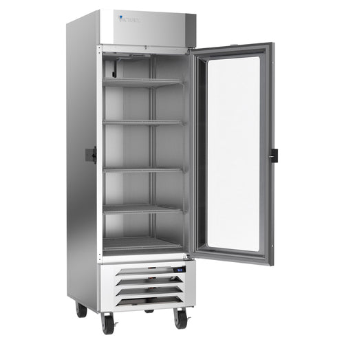 UltaSpec™ Series Merchandiser Refrigerator, Reach-in, one-section, self-contained refrigeration, 23.1 cu. ft. capacity, (1) full height hinged glass door, (5) epoxy coated shelves, stainless steel exterior, aluminum interior, electronic lock,standard depth cabinet, electronic LED lighting, expansion valve technology, Magnetic door gasket with 2 year warranty, stainless steel breakers, bottom mounted compressor, 1/4 HP, cULus, UL EPH Classified, UL-Sanitation, MADE IN USA