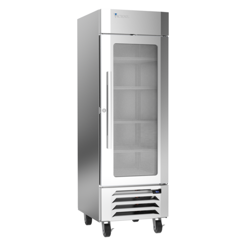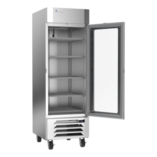 UltaSpec™ Series Merchandiser Refrigerator, Reach-in, one-section, self-contained refrigeration, 23.1 cu. ft. capacity, (1) full height hinged glass door, (5) epoxy coated shelves, stainless steel exterior, aluminum interior, standard depth cabinet, electronic LED lighting, expansion valve technology, Magnetic door gasket with 2 year warranty, stainless steel breakers, bottom mounted compressor, 1/4 HP, cULus, UL EPH Classified, UL-Sanitation, MADE IN USA