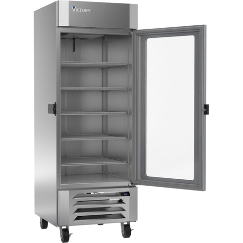 UltaSpec™ Series Merchandiser Refrigerator, Reach-in, one-section, self-contained refrigeration, 26.17 cu. ft. capacity, (1) full height hinged glass door, (5) epoxy coated shelves, stainless steel exterior, aluminum interior, electronic lock,standard depth cabinet, electronic LED lighting, expansion valve technology, Magnetic door gasket with 2 year warranty, stainless steel breakers, bottom mounted compressor, 1/4 HP, cULus, UL EPH Classified, UL-Sanitation, MADE IN USA