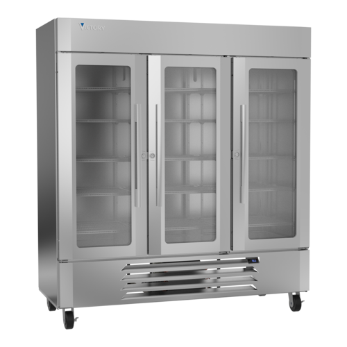 UltaSpec™ Series Merchandiser Refrigerator, Reach-in, three-section, self-contained refrigeration, 68.94 cu. ft. capacity, (3) full height hinged glass doors, (5) epoxy coated shelves per door section, stainless steel exterior, aluminum interior, standard depth cabinet, electronic LED lighting, expansion valve technology, Magnetic door gasket with 2 year warranty, stainless steel breakers, bottom mounted compressor, 1/2 HP, cULus, UL EPH Classified, UL-Sanitation, MADE IN USA