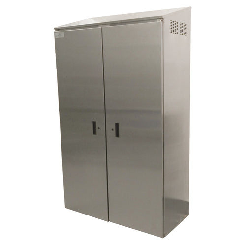 Cabinet with Mop Sink, 50-3/8"W x 22-3/4D x 84"H O.A., double hinged doors, right side mop sink 20"W x 16"D front to back x 12" deep (drain included), storage for mop bucket to roll in on left, (2) mop holders, (4) fixed intermediate shelves (3 on left, 1 on right above sink), slotted side panels for ventilation, 16/304 series stainless steel sink bowl, 18/304 series sink bowl apron, 18/430 series stainless steel cabinet, NSF