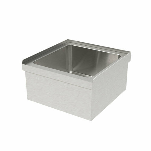 Mop Sink, floor mount, with 1" upturn, 24"W x 24"D x 15"H overall size, 20" across x 20" back-to-front x 10" deep bowl, includes plastic strainer, stainless steel construction, ETL