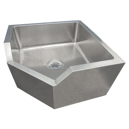 Corner Mop Sink, 22-1/2"W x 22-1/2"D x 8-1/2" deep bowl, 2" IPS drain, 16/300 stainless steel, integrated full-height apron welded to sink, notched out front, fully welded, NSF, Made in USA