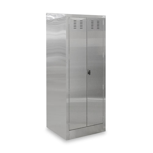 Janitor Cabinet, 25"W x 22-1/2"D x 84"H overall size, enclosed cabinet with open back for plumbing, (2) lockable louvered swing doors, includes: 20" x 16" x 12" deep mop sink with drain, overhead shelf, rear-mounted mop holder with (2) locking cams, service faucet with vacuum breaker and 120" hose, 18/300 stainless steel, NSF (Available in Effingham and Nevada)