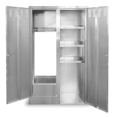 Janitor Cabinet, 48"W x 22-1/2"D x 84"H overall size, enclosed cabinet with open back for plumbing, (2) lockable louvered swing doors, right side includes: 20" x 16" x 12" deep mop sink with 3-1/2" drain, (1) over head shelf, (2) side mounted mop/broom holder with locking cam and panel-less back, left side includes: (3) shelves and bottom storage area, includes (1) service faucet with vacuum breaker and 120" hose, 18/300 stainless steel, NSF (Available in Effingham and Nevada)