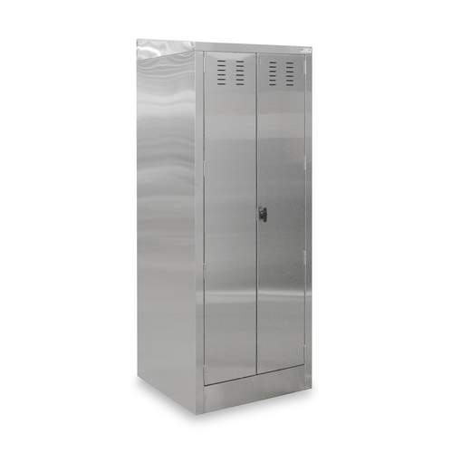Janitor Cabinet, 30"W x 30"D x 84"H overall size, enclosed cabinet with open back for plumbing, (2) lockable louvered swing doors, includes 24" x 24" x 12" deep mop sink with drain, overhead shelf, rear-mounted mop holder with (3) locking cams, service faucet with vacuum breaker and 120" hose, 18/300 stainless steel, NSF (Available in Effingham and Nevada)