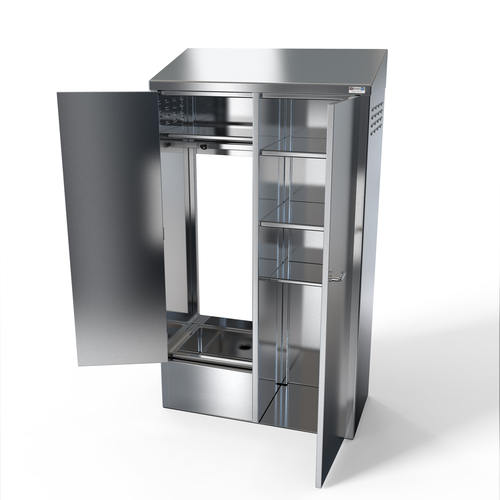 Mop Sink Cabinet, double width, 47-1/2"W x 22-1/4"D x 84-1/4"H overall size, (1) 20"W x 16" front-to back x 12" deep, 16/304 stainless steel construction mop sink on left side, holds (2) mops, (1) fixed overhead shelf, (3) fixed shelves in right side cabinet, (2) 20/430 stainless steel hinged doors with transverse rod handles & keyed locks, slanted top, 18/430 body construction, NSF