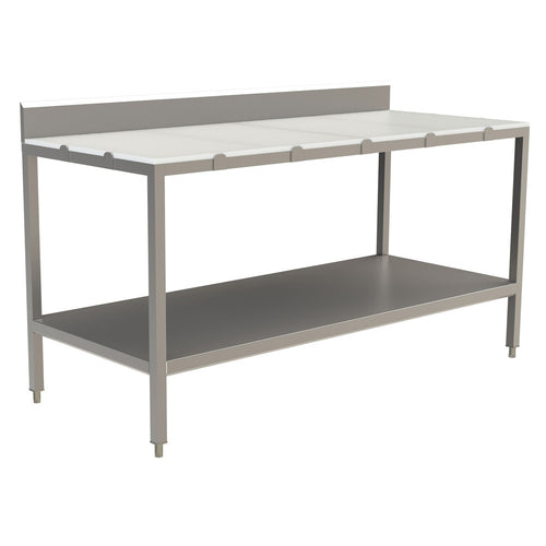 Poly Top Work Table, 36D x 48"W x 34"H overall size, poly board cutting surface, 5" backsplash, stainless steel undershelf, stainless steel legs with adjustable bullet feet, NSF, Made in USA