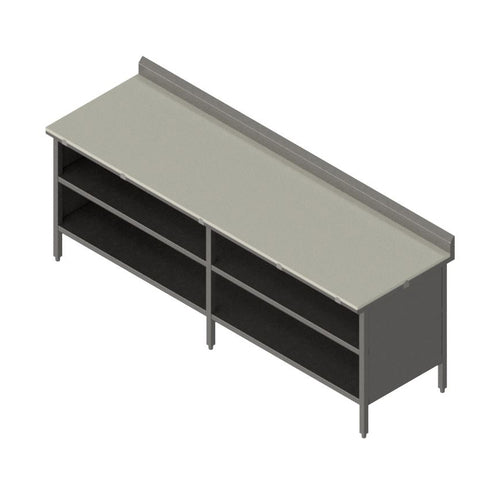 Work Table, cabinet base with open front, 132"W x 30"D, 3/4" reversible poly surface, 5" backsplash, Stallion Safety Edge on front, 16/300 stainless steel top, stainless steel construction, undershelf, & 1" adjustable bullet feet, all welded set-up, NSF